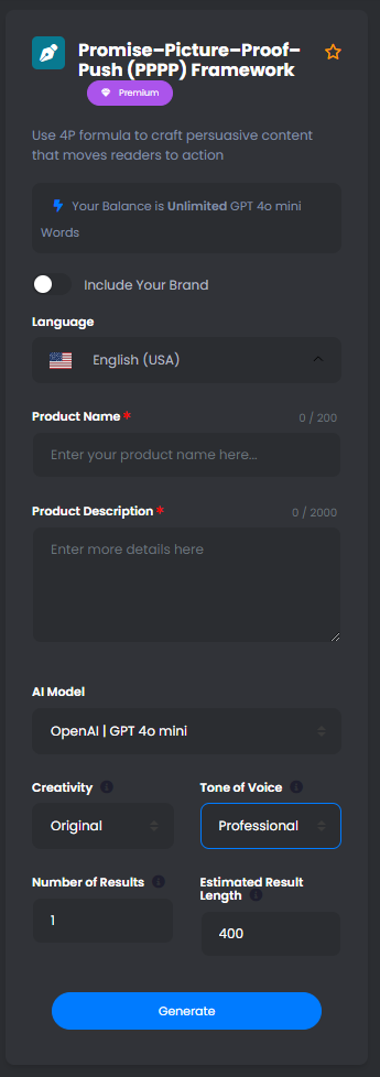 • Quickly create multiple PPPP frameworks for various products or services, allowing marketers to scale content production efforts.